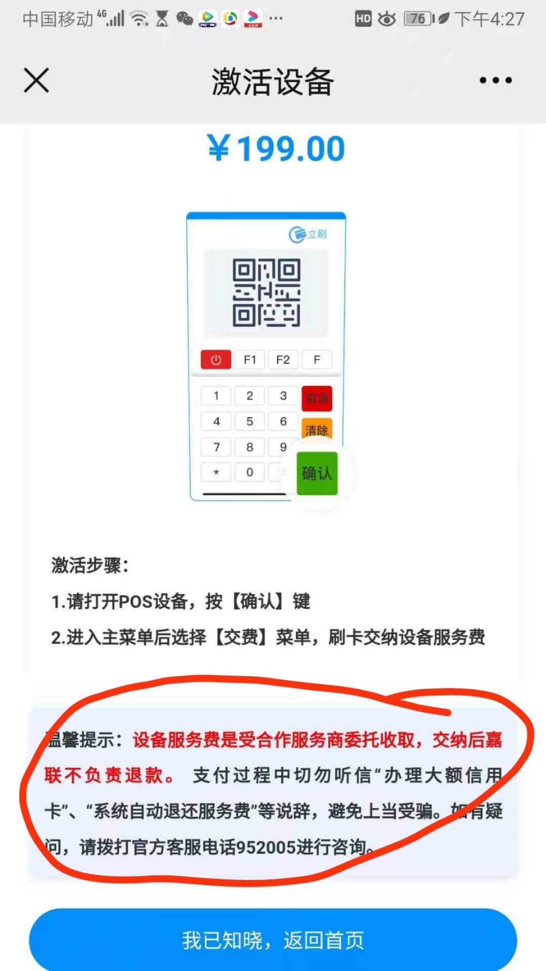 缴纳服务费激活:立刷电签版服务费有多个档次,分别为0元激活服务费、49元激活服务费、69元激活服务费、99元激活服务费、199元激活服务费、249元激活服务费、具体的服务费金额是根据立刷电签版POS机机具所属代理商进行设置的,换句话来说也就是服务费并不是必须要缴纳的,但是用户一旦缴纳服务费,将无法以任何形式退还。请千万不要相信有些底层代理商所说的,3个月之后返还服务费或者1年之后返还服务费之类的话,这些都是骗人的,只是诱骗用户缴纳服务费。